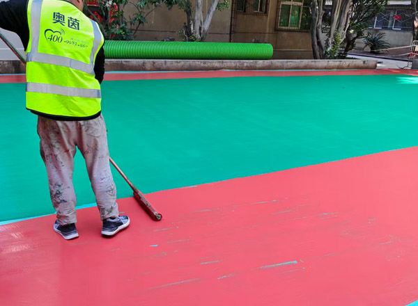 6、修補(bǔ)積水:第一層奧茵硅pu彈性層干固后,用積水法測(cè)試表面積水,積水處用彈性層材料填補(bǔ),修補(bǔ)時(shí)要注意修邊,不要高出積水周邊基面,若高出則用打磨機(jī)打磨平整。干固后檢查是否有凸出位置、顆粒狀雜物在表面,有則用150角磨機(jī)打磨平整,清理干凈再做下一道工序。