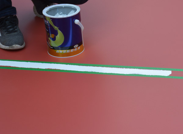 9、硅pu球場(chǎng)劃線工藝:測(cè)量球場(chǎng)主副場(chǎng)尺寸,做到奧茵硅pu球場(chǎng)顏色分區(qū)面層固化后,用鑒定過的鋼尺,經(jīng)緯儀放設(shè)點(diǎn)位線,內(nèi)控相對(duì)誤差為±0—±1/10000,用美紋紙沿線位兩邊粘貼,中間預(yù)留寬度尺寸應(yīng)符合球場(chǎng)的界線寬度要求。劃線主漆與固化劑攪拌后,請(qǐng)于1小時(shí)內(nèi)施工完成。留存的材料不可重復(fù)使用,按色別要求將劃線漆涂刷在美紋紙之間,待其涂漆表面干固將美紋紙撕掉即可。